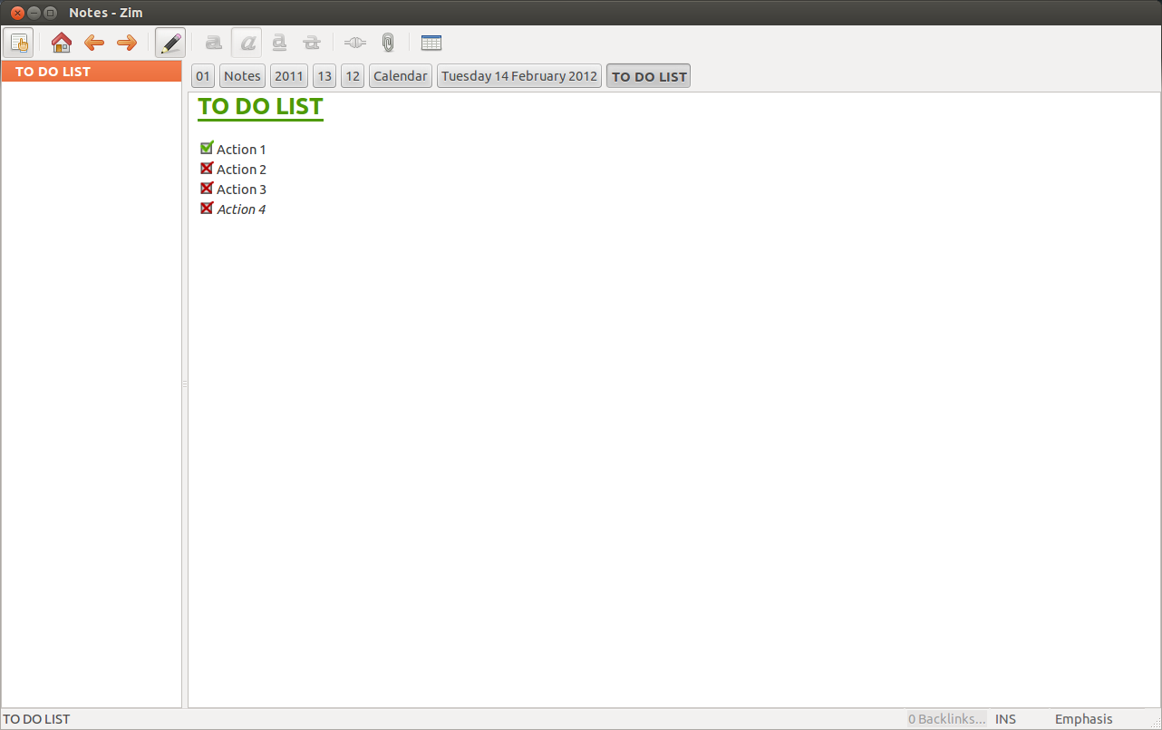 TIP: You can use Zim as a GTD organizer. To do that, you need to create a page for each group of tasks. For example, you can create a page for your 'waiting for' list, another page for your active projects and so on. For more information, i suggest you read this article which is a very detailed guide on how to implement the GTD method through Zim.