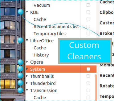 A Custom cleaner is a small tool that cleans the files left by a specific application. BleachBit includes a large collection of custom cleaners: