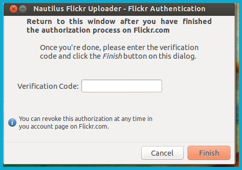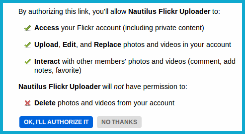 When you start Nautilus Flickr Uploader for the first time, it will ask your authorization so that it can upload your pictures to Flickr:
