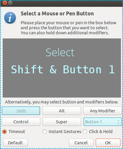 Select your key combination (i.e. Shift + Button 1) and close the window. To create your custom action, you need to record a new gesture:
