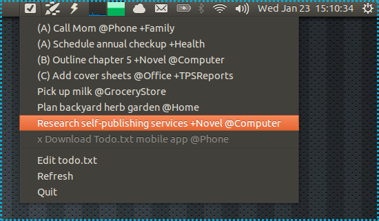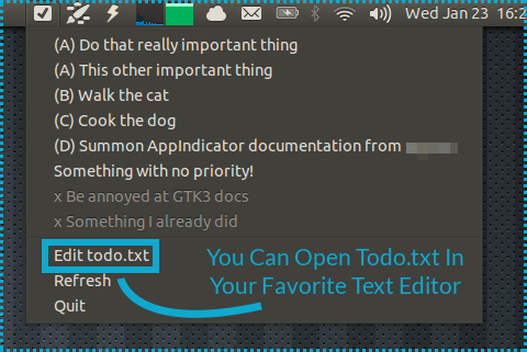 Todo Indicator is an App Indicator that follows the Todo.txt methodology. It is capable of both reading and editing Todo.txt files.
