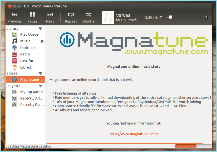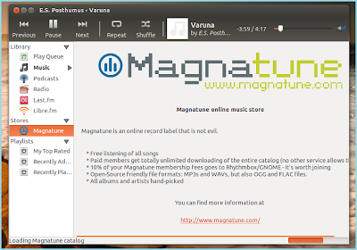 Rhythmbox features a unique “music browser”, which allows users to search for music that they love in a simple and easy to use format. Coupled with the unique feature of creating “automatic playlists”, which allows the user to create playlists that automatically include or exclude songs from the Library based on a user-defined set of criteria, Rhythmbox has set a new standard for what it means to be a “music player”. On top of these two unique features, Rhythmbox’s added ability to browse and download albums from online sites such as Jamendo and Magnatune make Rhythmbox truly a unique and exceptionally user-friendly music program.